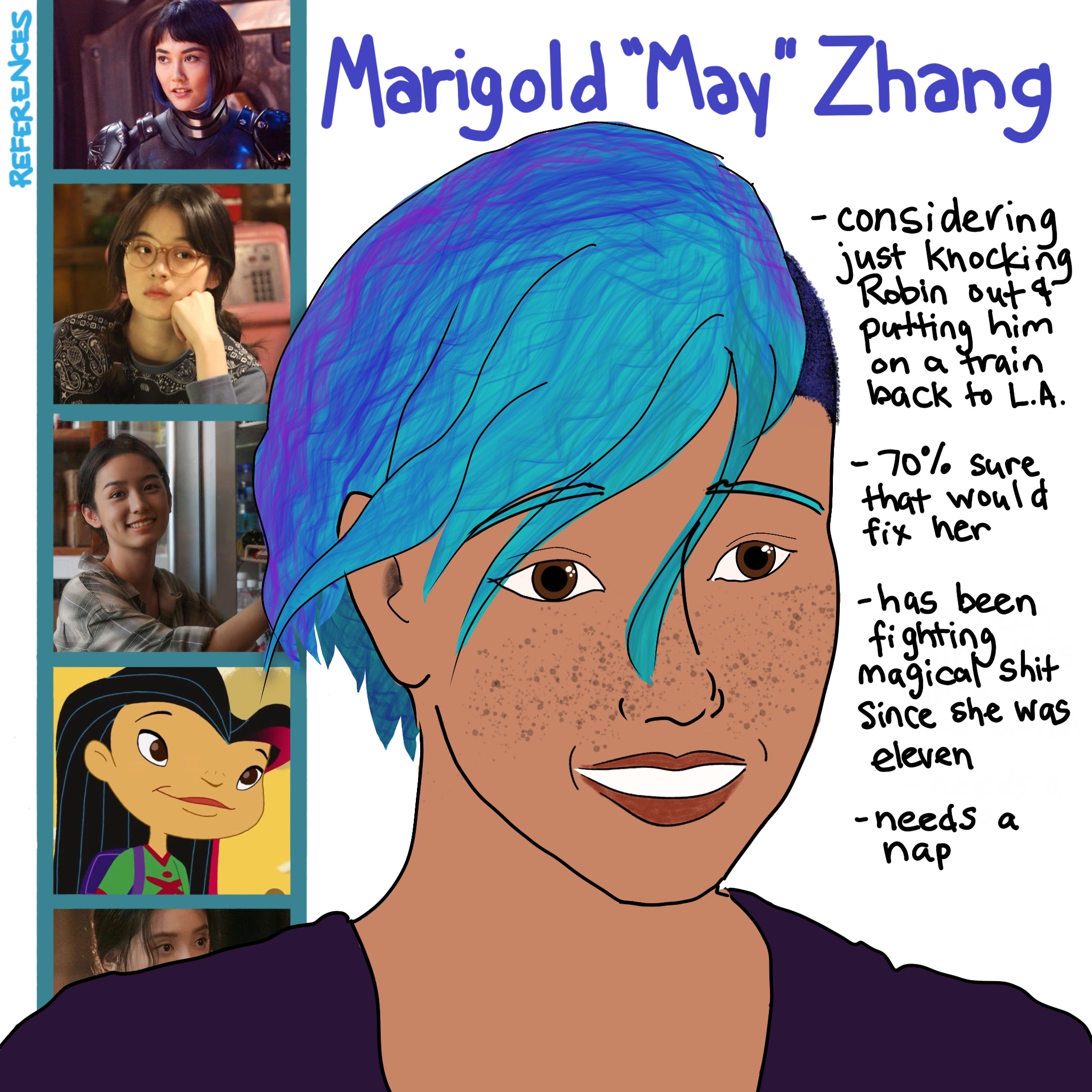 - short colored hair and grey eyes - feel free to go ham on her hair, she would